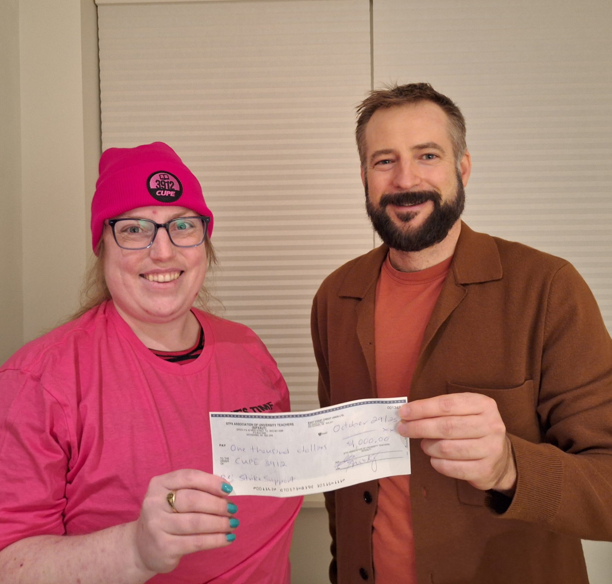 On behalf of the StFXAUT, Dr. Michael Follert, Department of Sociology (right), presents a $1,000 cheque to Katerina Allan, Vice-President Mount Saint Vincent for CUPE 3912.